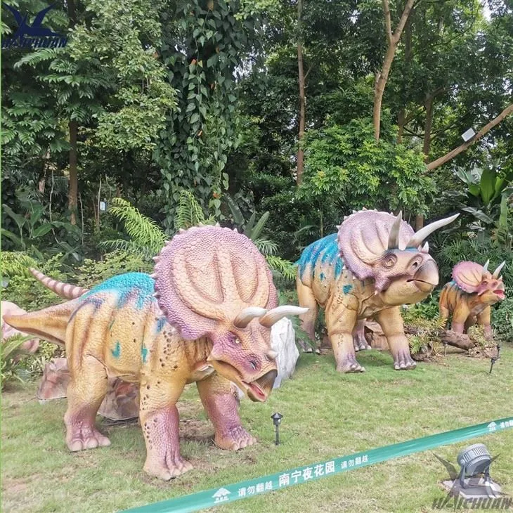 این یک گروه از مجسمه های Triceratops است، شما می توانید الگوی پیچیده سطح بدن Triceratops را به وضوح مشاهده کنید که توسط کارگران ساخته شده است. قسمت های مختلف خطوط متفاوتی دارند و با وجود اینکه دایناسور از اسفنج ساخته شده است، می توانید این خطوط پوست را مانند پوست بیرونی سخت دایناسور ببینید.